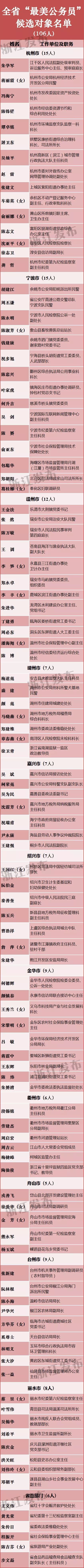 根据省委组织部、省委宣传部、省人力资源和社会保障厅、省公务员局《关于开展“选树全省最美公务员 展示浙江铁军风采”活动的通知》要求,经各地各部门逐级推荐、审核、遴选,拟定朱学军等106名同志为全省“最美公务员”候选对象,现予以公示。